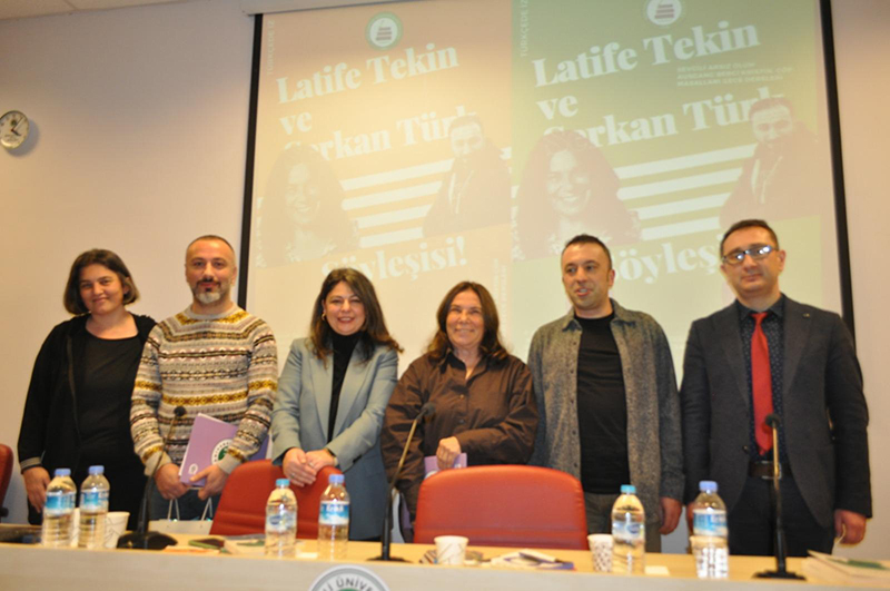 Türkçe Öğretmenliği Bölümü öğrenci kulübü Türkçede İZ'in davetlisi olarak fakültemize gelen yazarlar, Öğr. Gör. Dr. Gürkan Yavaş'ın moderatörlüğünde bir söyleşi gerçekleştirdiler. Öğrenci ve hocaların yoğun ilgi gösterdiği söyleşi, yazarların eserlerinden bölümler okunarak başladı. Edebiyat anlayışları ve yazma deneyimleri hakkında bilgi veren Tekin ve Türk, öğrencilerden gelen soruları da yanıtladılar. Söyleşi, Eğitim Fakültesi Dekanı Prof. Dr. Elif Çelebi Öncü'nün konuklara teşekkür belgesi ve hediye takdimi ile son buldu. Latife Tekin ve Serkan Türk, söyleşinin ardından fakültemizin fuayesinde kitaplarını imzaladılar.