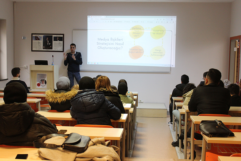 Etkinlik, öğrencilerin Halkla İlişkiler mesleğinin önemli uzmanlık alanlarından biri olan medya ilişkileri yönetimiyle alakalı teorik bilgilerin yanı sıra profesyonel hayattaki işleyişi de öğrenmesi için düzenlendi. Konuşmasına öncelikli olarak medya ilişkileri kavramından bahsederek başlayan Murat Aşık, “Bizim ilk işimiz araştırmadır. Çünkü medya ilişkilerini yapacağımız markayı ve bulunduğu sektörü öğrenmeniz gerekiyor.” diyerek medya ilişkilerinde yürütülmesi gereken stratejilerden bahsetti. “Medya stratejileri oluşturmak için önce markayı dinliyoruz ve neye ihtiyaçları olduğunu anlıyoruz. Daha sonra hedef kitlemizi belirleyerek markamızın SWOT analizini yapıyoruz. Böylece varmak istediğimiz hedefleri de net bir şekilde ortaya koyabiliyoruz.” dedi.