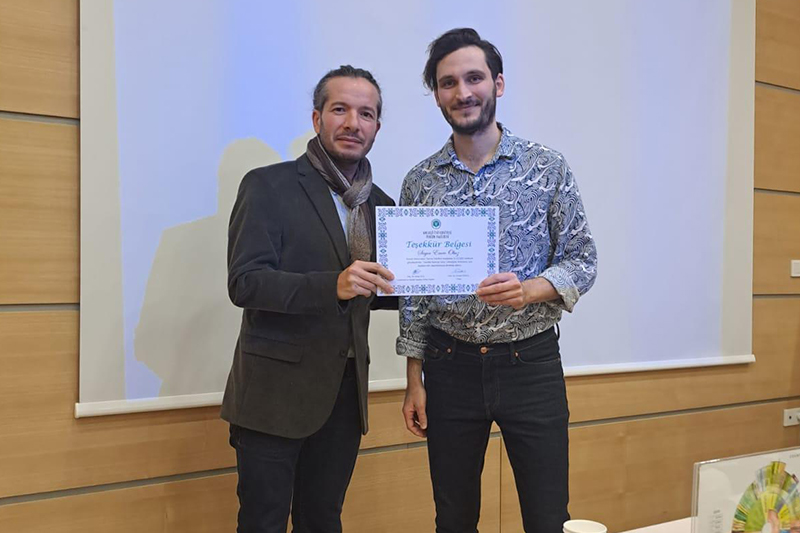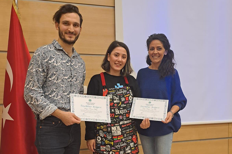 Etkinliğin sonunda Emre OBUZ ve Begüm Naz Obuz’a teşekkür belgeleri Turizm Fakültesi Dekanı Prof. Dr. Emrah Özkul ve Gastronomi ve Mutfak Sanatları Bölüm Başkanı Doç. Dr. Selda Uca tarafından takdim edildi.