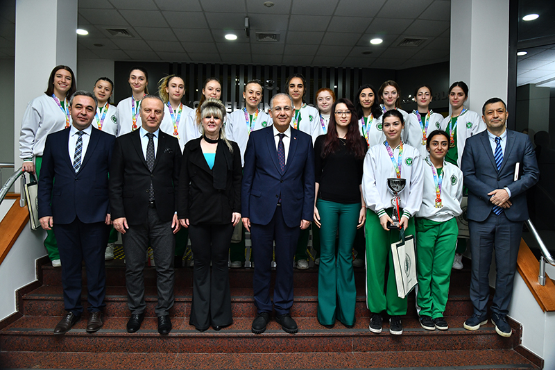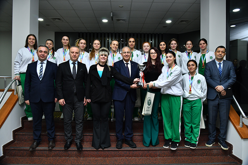 Şampiyon sporcuları Rektörlük makamında ağırlayan Rektörümüz Prof. Dr. Nuh Zafer Cantürk, şampiyon sporcularımızı tek tek tebrik ederken, başarılarının daim olması temennisinde bulundu. Şampiyon takımın kaptanı Melisa Kandemir, şampiyonluk kupasını Rektörümüz Prof. Dr. Nuh Zafer Cantürk’e takdim etti.