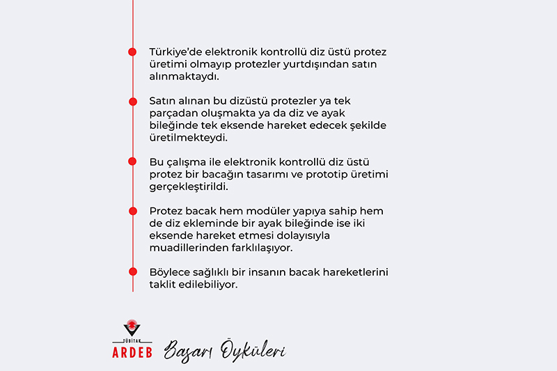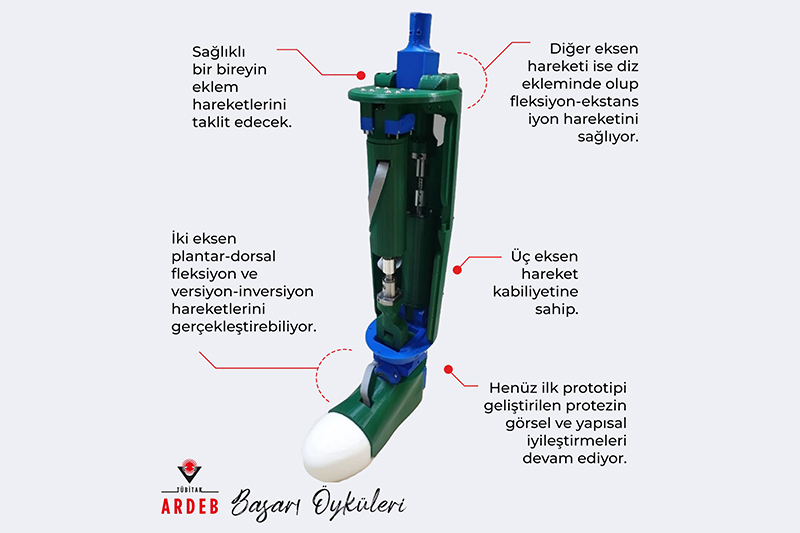 İlk prototipi geliştirilen ve görsel ile yapısal iyileştirmeler üzerine çalışmaların devam ettiği protez, sağlıklı bir bireyin eklem hareketlerini taklit edecek. Proje ve protez ile ilgili bilgiler paylaşan Kocaeli Üniversitesi Teknoloji Fakültesi Biyomedikal Mühendisliği Bölümü Öğretim Üyesi Prof. Dr. Serdar Küçük, “Türkiye'de elektronik kontrollü diz üstü protez üretimi olmayıp protezler yurtdışından satın alınmaktaydı. Satın alınan bu dizüstü protezler ya tek parçadan oluşmakta ya da diz ve ayak bileğinde tek eksende hareket edecek şekilde üretilmekteydi. Bu çalışma ile elektronik kontrollü diz üstü protez bir bacağın tasarımı ve prototip üretimi gerçekleştirildi. Protez bacak hem modüler yapıya sahip hem de diz ekleminde bir, ayak bileğinde ise iki eksende hareket etmesi dolayısıyla muadillerinden farklılaşıyor. Böylece sağlıklı bir insanın bacak hareketleri taklit edilebiliyor.” dedi.