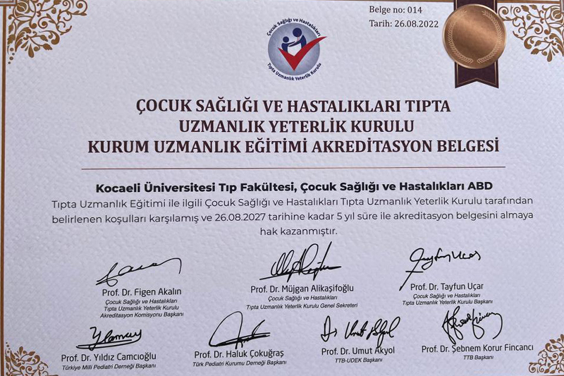 Kocaeli Üniversitesi Tıp Fakültesi Çocuk Sağlığı ve Hastalıkları ABD, Tıpta Uzmanlık Yeterlik Kurulu tarafından yapılan incelemeler sonucunda ‘Kurum Uzmanlık Eğitimi Akreditasyon Belgesi’ almaya hak kazandı. Kuzey Kıbrıs Türk Cumhuriyeti’nde düzenlenen 66. Türkiye Milli Pediatri Kongresi’nde, Kocaeli Üniversitesi Tıp Fakültesi Çocuk Sağlığı ve Hastalıkları ABD Başkanı Prof. Dr. Metin Aydoğan akreditasyon belgesini Sağlık Bakanı Fahrettin Koca’dan teslim aldı.