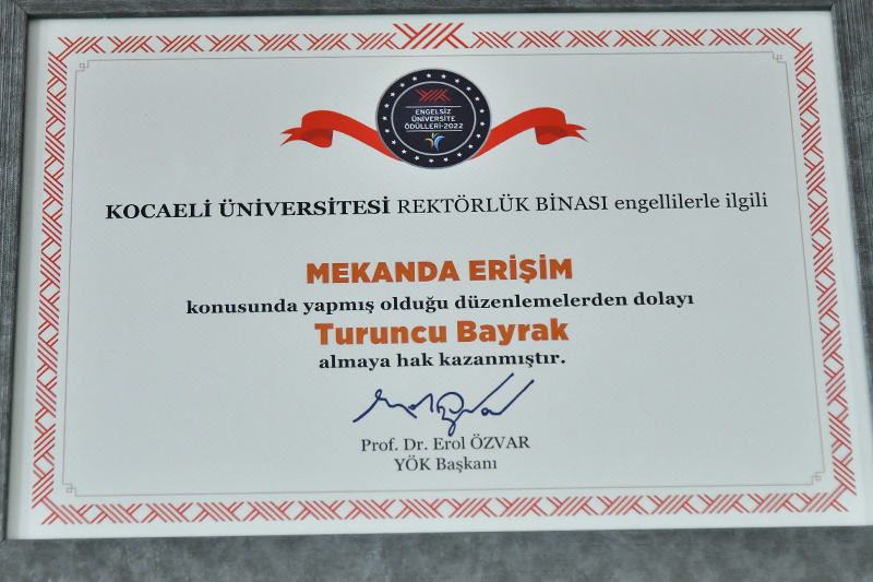 Kocaeli Üniversitesi, engelsiz üniversite olma yolunda bir aşamayı daha tamamladı. YÖK tarafından verilen Mekânda Erişebilirlik-Turuncu Bayrak ödülünü, Kütüphane Binası ardından, bu yıl da Rektörlük Binası aldı.
