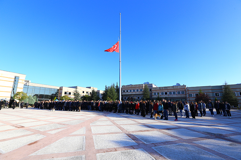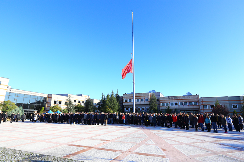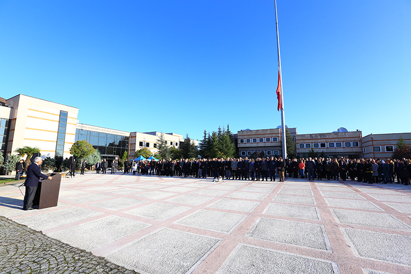 Tören, Rektörümüz Prof. Dr. Sadettin Hülagü'nün Atatürk Anıtı'na çelenk sunması ile başladı. Prof. Dr. Baki Komsuoğlu Kültür ve Kongre Merkezi’nde düzenlenen törende saatler 9.05'i gösterdiğinde, 2 dakikalık saygı duruşu ile Türkiye Cumhuriyeti'nin Banisi Büyük Önder Gazi Mustafa Kemal Atatürk, ebediyete irtihal edişinin 84. sene-i devriyesinde üniversitemizde anıldı. Saygı duruşunun ardından, İstiklal Marşı okundu. Törende Rektörümüz Prof. Dr. Sadettin Hülagü bir de konuşma gerçekleştirdi.