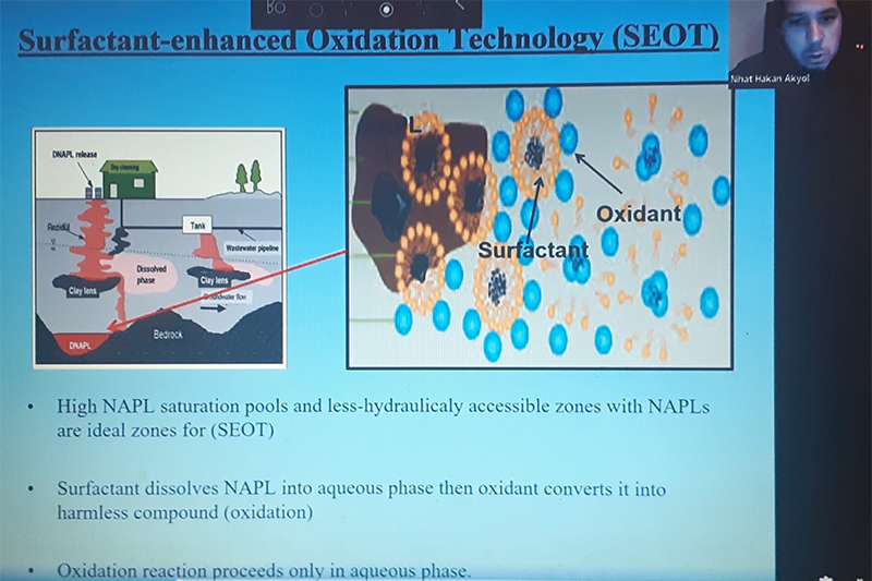 Doç. Dr. Akyol sunumunda, “Trikloroetilen (TCE) önemli DNAPL (Yoğun Suyla Karışmayan Organik Kirletici) kirletici gruplarından olup metal sanayinde ve havacılıkta yağ çözücü, kuru temizlemede ve elektronik sanayi gibi birçok alanda kimyasal solvent olarak kullanılmaktadır. TCE kütleleri yeraltına çoğunlukla DNAPL (Dense non-aqueous phase liquids) olarak girer ve özellikle yeraltında geçirimsiz jeolojik sistemlerin üzerinde depolanarak yüksek doygunlukta DNAPL birikintileri oluşmasına olanak sağlayarak, uzun vadede yer altı su kaynakları için potansiyel risk oluşturmaktadır. DNAPL kütlelerine uygulanan yerinde ıslah teknolojilerinden yüzey aktif madde içeren permanganatlı oksidasyon yöntemi ile bu kütleler başarılı bir şekilde ıslah edilebilmektedir.” dedi.