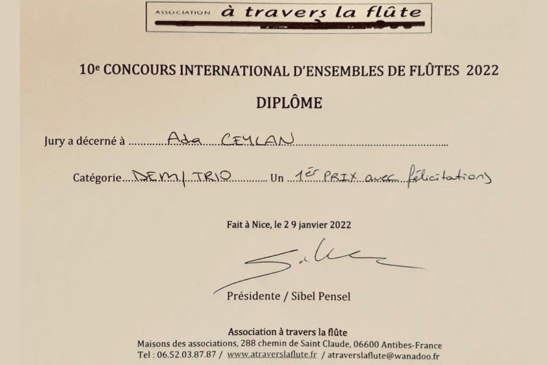 Devlet Konservatuvarımız Müzik ve Sahne Sanatları Lisesi 11. Sınıf öğrencisi Ada Ceylan, A Travers La Flûte Derneği'nin Fransa Nice'de düzenlediği Flutissimo 2022 Ensemble yarışmasında kendi kategorisinde 1.lik aldı.