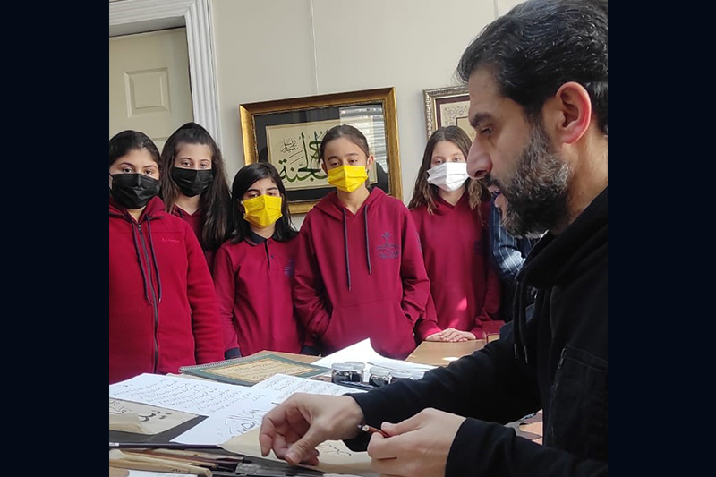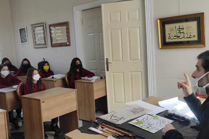 Tezhip, Minyatür, Ebru ve Hüsn-i Hat kurslarında üretilen eserleri inceleyen öğrenciler, Hat kursu hocası Hattat Erol Balcı tarafından Hat sanatı hakkında bilgilendirildiler.