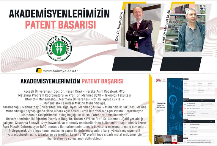Kocaeli Üniversitesi Hereke Asım Kocabıyık MYO Metalurji Program Koordinatörü Doç. Dr. Hasan Kaya ve Teknoloji Fakültesi Otomotiv Mühendisliği Bölüm Başkanı Prof. Dr. Mehmet Uçar’ın yer aldığı, Marmara Üniversitesi Mühendislik Fakültesi Makine Mühendisliği Öğretim Üyesi Prof. Dr. Aykut Kentli ile Karamanoğlu Mehmetbey Üniversitesi Mühendislik Fakültesi Makine Mühendisliği Öğretim Üyesi Dr. Öğr. Üyesi Mehmet Şahbaz paydaşlığında “İnce Cidarlı Açık Kesitli Profil İçin Yeni Bir Aşırı Plastik Deformasyon Metodunun Geliştirilmesi” adlı buluş, Türk Patent Enstitüsü tarafından tescillendi.