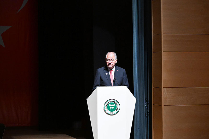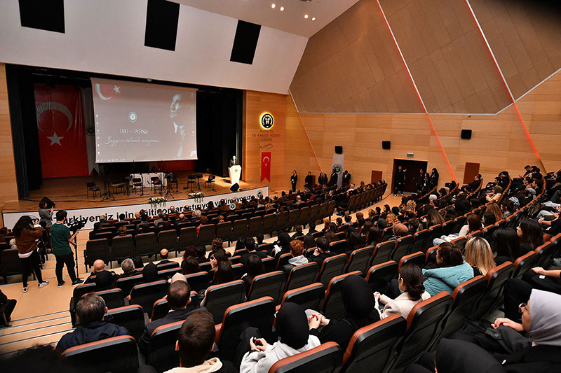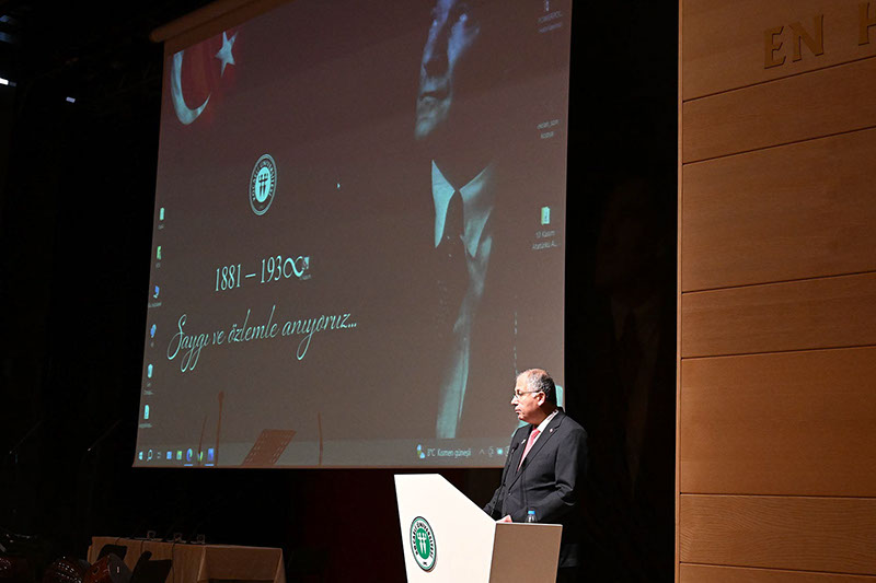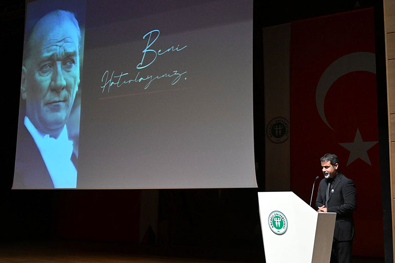 Program Rektörümüz Prof. Dr. Nuh Zafer Cantürk'ün konuşması ile başladı. Cumhuriyetimizin kurucusu büyük önderin aziz milletimizin kalbinde müstesna bir yere sahip olduğunu ifade eden Rektörümüz Prof. Dr. Nuh Zafer Cantürk, "Gazi Mustafa Kemal Atatürk, Türk milletinin özgürlüğünü ve bağımsızlığını savunmuş, askerlikle devlet adamlığını bağdaştırmış, Türkiye'yi modern bir cumhuriyete dönüştürmüş, eğitim ve bilim alanlarında önemli reformlar yapmış ve döneminin nadir dehalarından biri olarak tarihte de önemli bir yere sahiptir. Gerçekleştirdiği devrimler ile Türk milletine çağ atlatmış, Türkiye Cumhuriyeti'nin dünya ülkeleri arasında saygın bir hale gelmesini sağlamıştır." dedi.