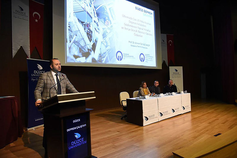 Karadeniz Teknik Üniversitesi Öğretim Üyesi Prof. Dr. Ahmet Can Altunışık, ülkemizde son 20 yılda yaşanan deprem felaketleri, gözlemlenen yapısal hasarlar ve ileriye dönük alınması gerekenler önlemler hakkında bilgi ve deneyimlerini paylaştı. Fotoğraf kareleri eşliğinde yaşanan depremlerdeki yapısal hasarları karşılaştıran Prof. Dr. Ahmet Can Altunışık, sunumunun sonunda alınması gereken tedbirlerle ilgili değerlendirmelerde bulundu.