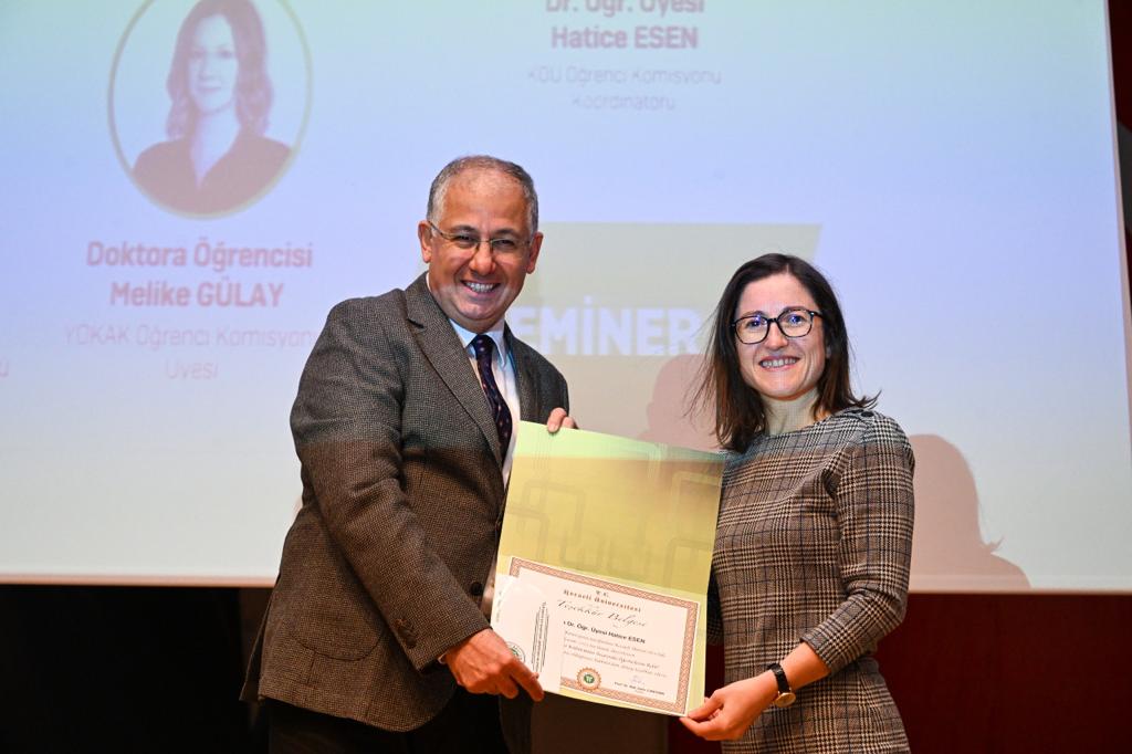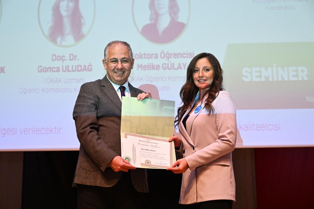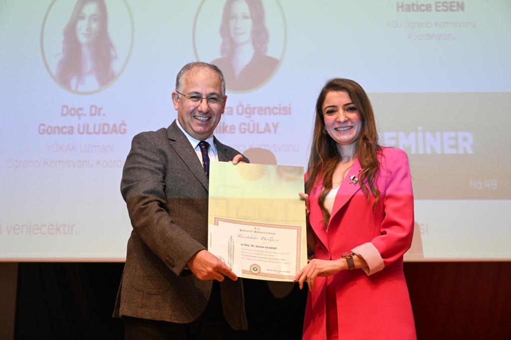 Seminerde bir sunum yapan YÖKAK Öğrenci Komisyonu Koordinatörü Doç. Dr. Gonca Uludağ, 49.’sunu düzenledikleri etkinlikte ilk defa öğrencilerin bu kadar yoğun ilgisiyle karşılaştıklarını belirtti. Öğrencilerin burada olmasının büyük önem arz ettiğini söyleyen Doç. Dr. Gonca Uludağ, “Bugün anlatılacak konular, aslında sizlerin daha nitelikli eğitim almanızı amaçlıyor. Yükseköğretim kurumlarında kalite güvencesi sisteminin en önemli boyutu, öğrencilerin hedeflenen yeterliliklere ulaşabilmesinin güvence altına alınmasıdır.” dedi. Doç. Dr. Gonca Uludağ Yükseköğretim Kalite Kurulu (YÖKAK) hakkında da bilgiler paylaştı. Rektörümüz Prof. Dr. Nuh Zafer Cantürk tarafından konuşmacılara teşekkür belgesi verilmesinin ardından seminer, soru cevap bölümü ve toplu fotoğraf çekimleri ile sona erdi.