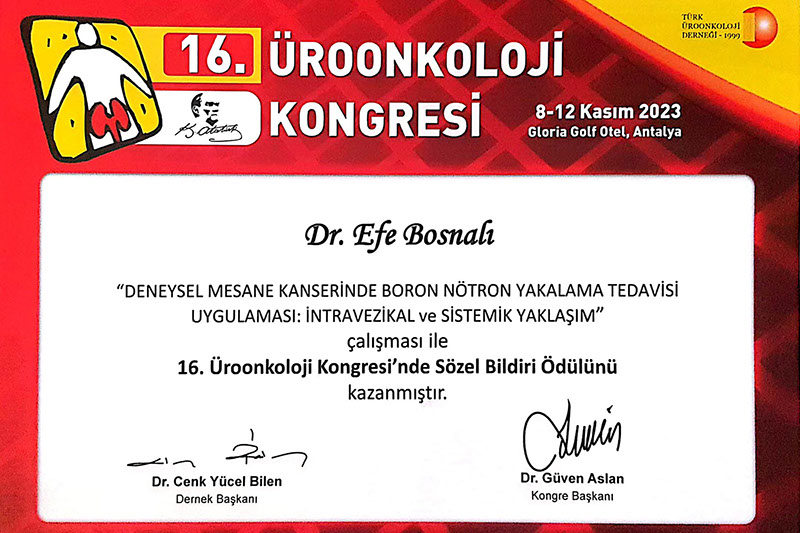 Türkiye Sağlık Enstitüsü Başkanlığı (TÜSEB) tarafından desteklenmiş olan Kocaeli Üniversitesi Tıp Fakültesi Üroloji Anabilim Dalı ile Radyasyon Onkoloji Anabilim Dalı ve İstanbul Teknik Üniversitesi tarafından gerçekleştirilen 7 disiplinden 18 araştırmacının görev aldığı "Deneysel Mesane Kanserinde Boron Nötron Yakalama Tedavisİ Uygulaması: İntravezikal ve Sistemik Yaklaşım" başlıklı çalışma, 16. Üroonkoloji Kongresi'nde sözel bildiri ödülü kazandı.