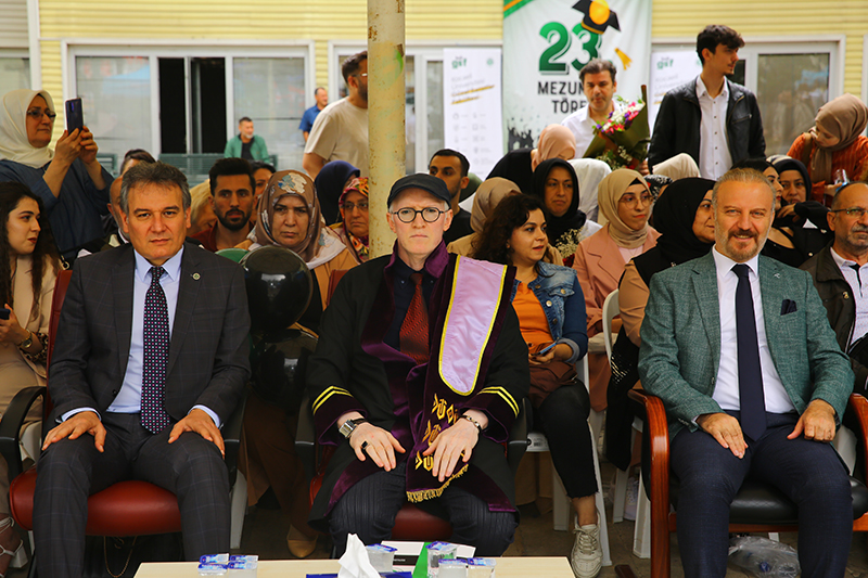 Güzel Sanatlar Fakültesi mezuniyet törenine Rektör Yardımcısı Prof. Dr. Mehmet Yıldırım, Genel Sekreter Doç. Dr. Mustafa Eren, Dekanlar, Müdürler, Akademisyenler ile mezun öğrenciler ve aileleri katıldı.