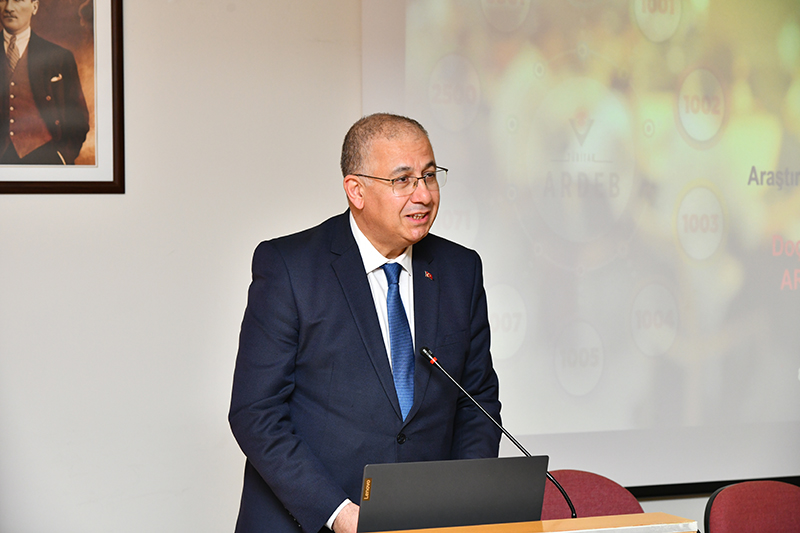 Rektörümüz Prof. Dr. Nuh Zafer Cantürk'ün yaptığı konuşma ardından, Moderatörlüğünü Rektör Yardımcısı Prof. Dr. Elif Öğüt'ün yaptığı, TÜBİTAK ARDEB Başkan Yardımcısı Doç. Dr. Cengiz Arıcı'nın konuşmacı olarak yer aldığı ARDEB Destek Programları ve Yeniliklerin anlatıldığı sunuma geçildi. Doç. Dr. Arıcı sunumunda, temel stratejiler, destek programları, istatistikler, fikri haklar, yenilikler ve ara yüzler başlıklarında bilgiler paylaştı.