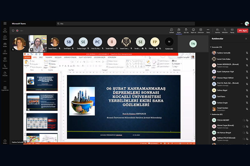 Rektörümüz Prof. Dr. Nuh Zafer Cantürk’ün konuşmasının ardından Kocaeli Üniversitesi Mühendislik Fakültesi Jeofizik Mühendisliği Öğretim Üyesi Prof. Dr. Şerif Barış “Kahramanmaraş Depremlerinden Öğrendiklerimiz” , Jeofizik Mühendisliği Bölüm Başkanı Prof. Dr. Fadime Sertçelik “Kahramanmaraş Depremlerinin Analizi (Saha gözlemleri)”, İnşaat Mühendisliği Dr. Öğr. Üyesi Serkan Engin “Kahramanmaraş Depremleri Sonrası Yapı Stoklarının Değerlendirilmesi”, Tıp Fakültesi Öğretim Üyesi Prof. Dr. Serkan Yılmaz “Kahramanmaraş Depremleri Sonrası Acil Sağlık Hizmetleri” , Tıp Fakültesi Öğretim Üyesi Prof. Dr. Aslıhan Polat “Kahramanmaraş Depremleri Sonrası Psikososyal Destek Hizmetleri”, Fen Bilimleri Enstitüsü Müdürü Prof. Dr. K. Süleyman Yiğit “KOÜ Deprem Dayanışma Grubu Faaliyetleri”, Eğitim Fakültesi Öğretim Üyesi Doç.Dr. Nejat Akfırat “Kahramanmaraş Depremleri Sonrası PDR Anabilim Dalı Çalışmaları”, İletişim Fakültesi Öğretim Üyesi Doç.Dr. Selma Koç “Afetlerde İletişim ve Medyanın Rolü”, Spor Bilimleri Fakültesi Öğr. Gör. Dr. Cem Kaba “Depremde Gönüllü Organizasyonu ve Destek Hizmetleri”, Basın ve Halkla İlişkiler Koordinatörü Öğr. Gör. Dr. Alim Alper Cesur “Kocaeli Üniversitesi ve Medya Çalışmaları” ile Şube Müdürü İmdat Akbaba ise “Kocaeli Üniversitesi AFAD Gönüllülük Hizmetleri” başlıklı konuşmalarını gerçekleştirdiler.