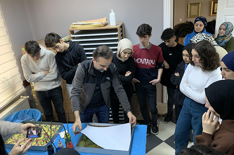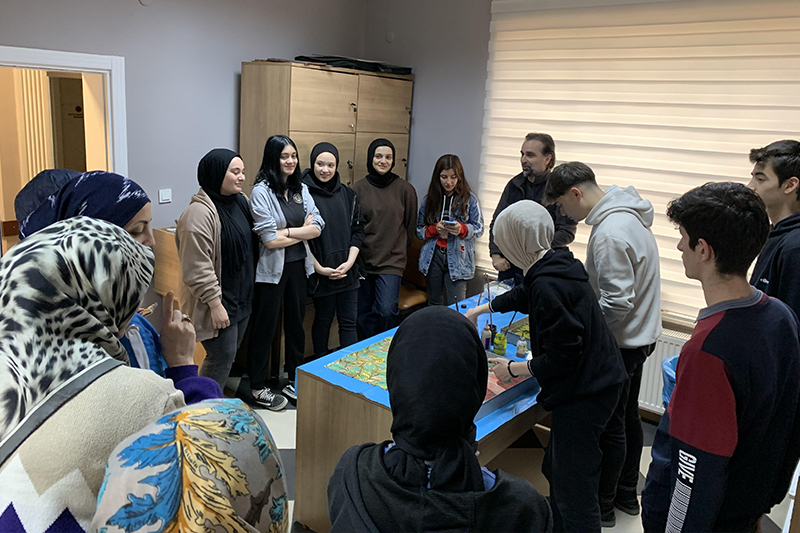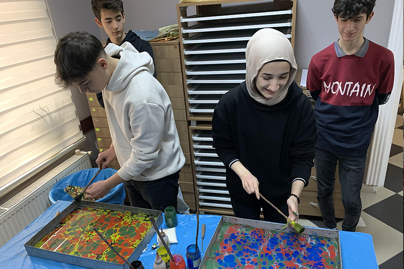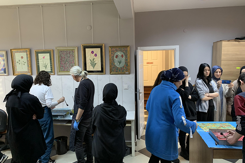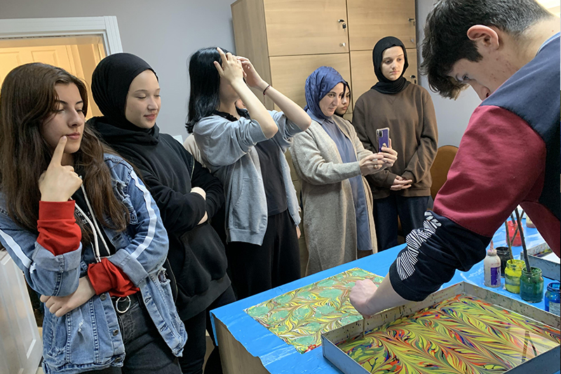 Kültür Evi Koordinatörü ve Güzel Sanatlar Fakültesi Geleneksel Türk Sanatları Bölüm Başkanı Dr. Öğr. Üyesi Yıldırım Karadeniz, Kültür Evi'ndeki kurslar hakkında öğrencileri bilgilendirdi. Özellikle Geleneksel Türk Sanatları (Hat, Tezhip, Minyatür, Ebru) hakkında bilgiler alan ve eserleri inceleyen öğrenciler, daha sonra ebru uygulama atölyesinde ebru yaptılar.