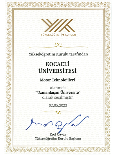Kocaeli Üniversitesi’nin araştırma üniversitesi olma yolunda önemli bir adımı daha geride bıraktı. Yükseköğretim Kurulu tarafından hayata geçirilen Öncelikli Alanlarda Uzmanlaşan Üniversiteler Proje kapsamında Kocaeli Üniversitesi, ‘Motor Teknolojileri’ alanında Uzmanlaşan Üniversite olarak seçildi. Rektörümüz Prof. Dr. Nuh Zafer Cantürk, uzmanlaşan üniversite belgesini YÖK Başkanı Prof. Dr. Erol Özvar’dan alırken, Rektörümüze Teknoloji Fakültesi Otomotiv Mühendisliği Bölüm Başkanı Prof. Dr. Mehmet Uçar da eşlik etti.