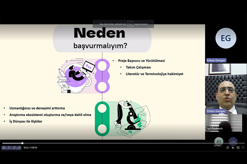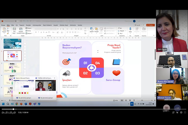 2023 Yılı Birinci Dönem başvuruları açılan TÜBİTAK 2209-A (Üniversite Öğrencileri Araştırma Projeleri Destekleme Programı) ve TÜBİTAK 2209-B (Üniversite Öğrencileri Sanayiye Yönelik Araştırma Projeleri Desteği Programı) Programlarına dair Eğitim Toplantısı 11 Mayıs da çevrim içi olarak gerçekleştirildi.