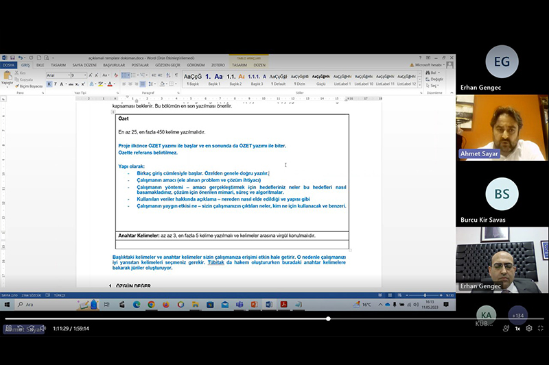 Toplam 203 katılımcının katıldığı toplantıda, Açılış Konuşmasını; Rektör Yardımcısı Prof. Dr. Elif Öğüt yaptı. Prof. Dr. Elif ÖĞÜT, araştırma üniversitesi olma vizyonu çerçevesinde her alanda büyük atılımlar yapma kararlılıklarını yinelerken bu tür eğitim çalışmalarının bu anlamda önemli araçlar olduğunu vurguladı. Eğitimde, Kocaeli Üniversitesi Mühendislik Fakültesi’nden Prof. Dr. Ahmet Sayar ve Dr. Öğr. Üyesi Burcu KIR Savaş ile İzmit MYO Müdürü Doç. Dr. Erhan Gengeç sunumlarını gerçekleştirdi.