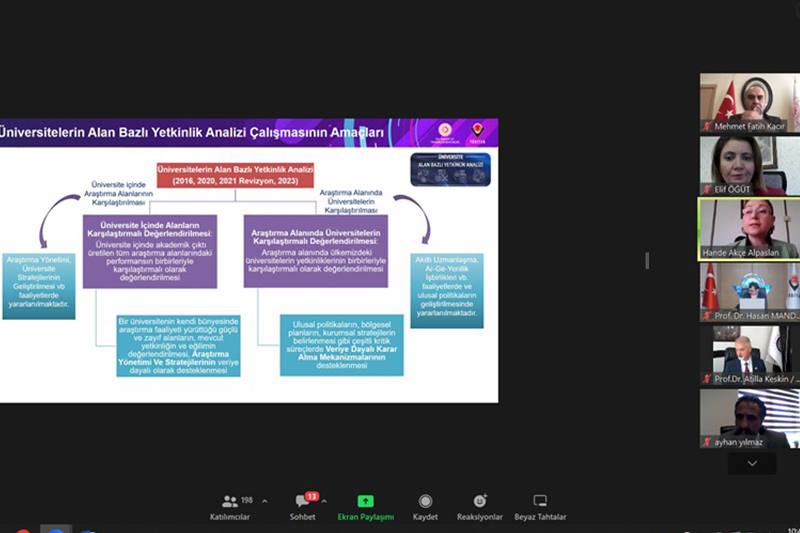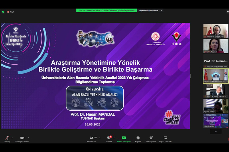 TÜBİTAK tarafından “Üniversitelerin Alan Bazında Yetkinlik Analizi” 2023 yılı çalışmasının sonuçlarının ilan edilmesi ve bilgi paylaşımı amacıyla çevrimiçi bir bilgilendirme toplantısı düzenlendi. TÜBİTAK Başkanı Prof. Dr. Hasan Mandal’ın moderatörlüğünde, Sanayi ve Teknoloji Bakan Yardımcısı Mehmet Fatih Kacır’ın katılım gösterdiği toplantıda üniversitemizden Rektör Yardımcısı Prof. Dr. Elif Öğüt yer aldı.