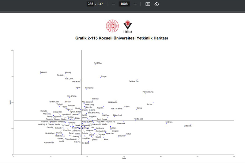 Üniversitelerin araştırma alanları bazında performanslarının birbirlerine karşılaştırmalı olarak değerlendirilebilmesini sağlamak amacıyla yayınlanan Üniversitelerin Alan Bazında Yetkinlik Analizi’nde Kocaeli Üniversitesi’nin de yetkinlik haritasının açıklandı. Çalışmada; 132 alt araştırma alanı temelinde hesaplamalar yapılmış ve grafik çizilmesi için yeterli minimum veri sayısına sahip 130 alt araştırma alanına ait grafikler hazırlandı. Analize tabi tutulan araştırma alanları, önceki çalışmada kullanılan alan sınıflaması üzerinden TÜBİTAK danışma ve grup yürütme kurulu ile araştırma merkez ve enstitülerinden yetkin uzmanların değerlendirmeleri; “All Science Journal Classification”(ASJC) sınıflandırması; ülkemizin çeşitli politika belgelerinde yer bulan güncel ülke ihtiyaçları ve güvenliği açısından kritik alanlar ile üniversitelerin eğitim alanları dikkate alınarak oluşturuldu.