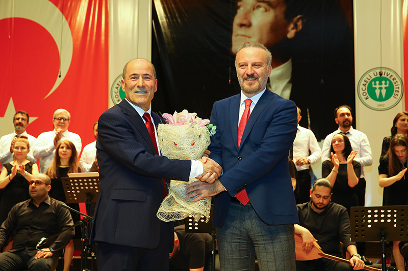 Konserde, Şef İsmet Ünsal’a çiçek takdimini Genel Sekreter Doç. Dr. Mustafa Eren yaptı.