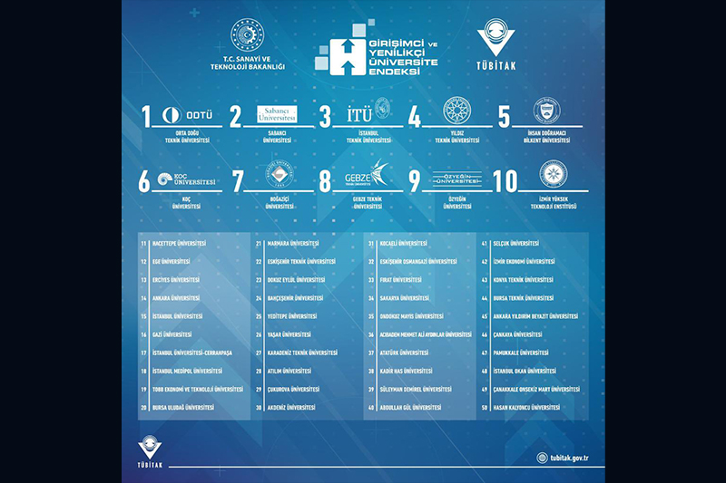 TÜBİTAK’ın hazırladığı 2022 yılı Girişimci ve Yenilikçi Üniversite Endeksinde ilk 50 üniversite belirlendi. Listede Kocaeli Üniversitesi de en girişimci ve yenilikçi üniversiteler arasında olma başarısı gösterdi.
