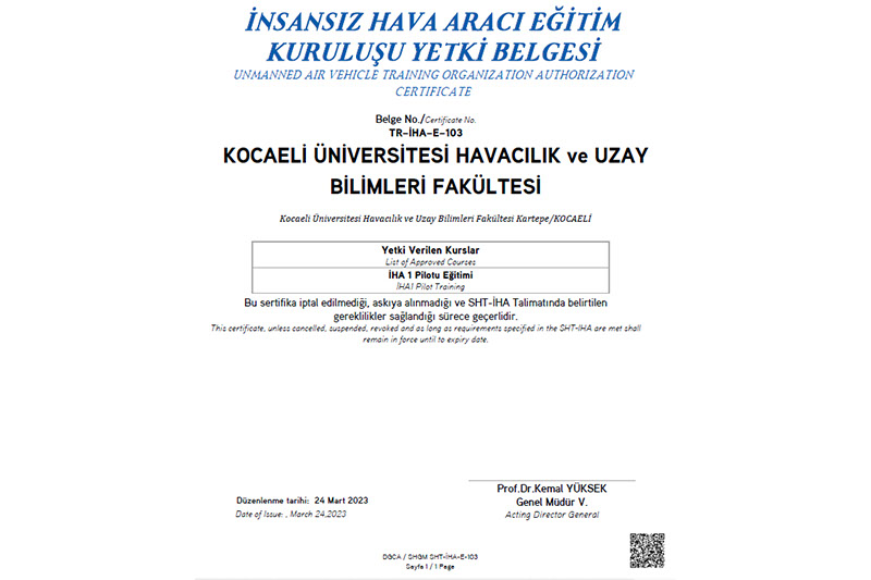Kocaeli Üniversitesi Havacılık ve Uzay Bilimleri Fakültesi, Sürekli Eğitim Araştırma ve Uygulama Merkezi aracılığıyla Sivil Havacılık Genel Müdürlüğü’ne yaptığı başvurunun incelenmesi sonucu “İnsansız Hava Aracı Eğitim Kuruluşu Yetki Belgesi” almaya hak kazandı.