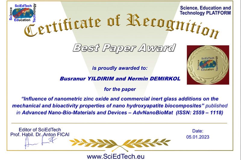 Kocaeli Üniversitesi Güzel Sanatlar Fakültesi Seramik Bölümü öğretim üyesi Doç. Dr. Nermin Demirkol danışmanlığında, Kocaeli Üniversitesi Teknoloji Fakültesi Biyomedikal Mühendisliği yüksek lisans öğrencisi Büşranur Yıldırım’ın yüksek lisans tez çalışmasından yapılan ‘Influence of Nanometric Zinc Oxide and Commercial Inert Glass Additions on the Mechanical and Bioactivity Properties of Nano Hydroxyapatite Biocomposites’ isimli makale Romanya’dan en iyi yayın ödülü aldı.