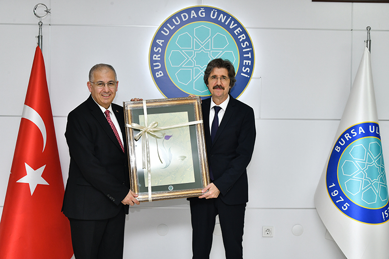 Göreve yeni atanması sebebiyle hayırlı olsun ziyareti gerçekleştiren Rektörümüz Prof. Dr. Nuh Zafer Cantürk, Bursa Uludağ Üniversitesi Rektörü Prof. Dr. Ferudun Yılmaz ‘a yeni görevinde başarılar dileyerek hediye takdiminde bulundu.