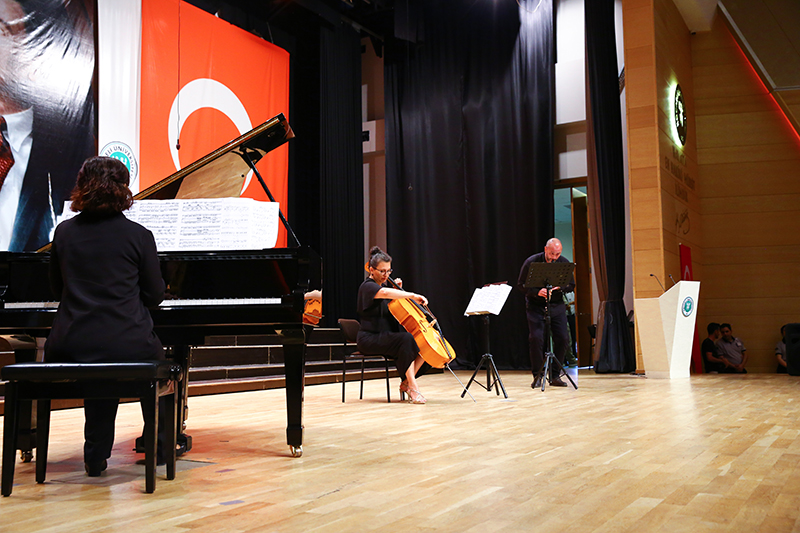 Saygı duruşunda bulunulması ve İstiklal Marşı'nın okunması ile başlayan törende müzik dinletisi için sahneye davet edilen Güzel Sanatlar Fakültesi Öğretim Üyelerinden Öğr. Gör. Yeşim Madanoğlu, Dr. Öğr. Üyesi Neşe Grançer Okay ve Dr. Öğr. Üyesi Kubilay Gürbüz, katılımcılardan büyük beğeni topladı.