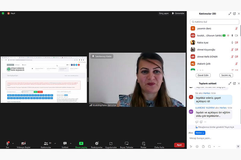 22 Eylül Cuma günü, online olarak gerçekleştirilen eğitime, Kocaeli Üniversitesi akademik ve idari personelinin yanı sıra çok sayıda öğrenci ilgi gösterdi. Gerçekleştirilen eğitimde, Kocaeli Üniversitesi Kütüphane üyelik işlemleri, eser istek, kitap ayırtma, katalog taramalarının nasıl yapılacağı gibi konularda uygulamalar gerçekleştirilirken, kütüphane kullanımı ve hizmetleri hakkında genel bilgilendirmeler yapıldı.