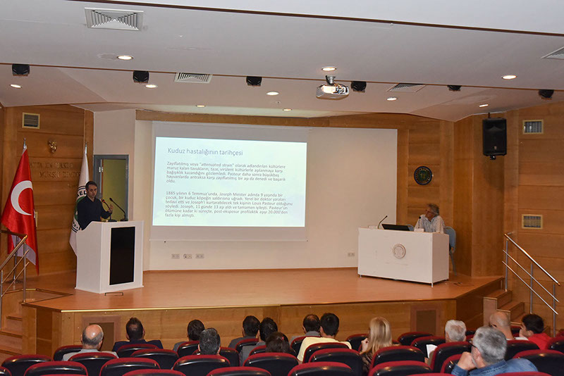 Seminerin konuk konuşmacısı olan Koçak Farma Biyoteknik Ar-Ge Kuduz Aşısı Proje Müdürü Dr. Vet. Hekim Engin Alp, kuduzun insanlar ve memeli hayvanlar arasında ciddi bir virüs hastalığı olduğunu vurguladı. Ayrıca, zoonotik bir hastalık olan kuduzun, hayvanların enfeksiyöz salyası ile temas veya ısırma yoluyla insanlara bulaşabileceğini belirtti. Enfeksiyon riski taşıyan kişilerde temas sonrası profilaksinin kuduz hastalığını önlenebilir hale getirebileceğini ifade etti.